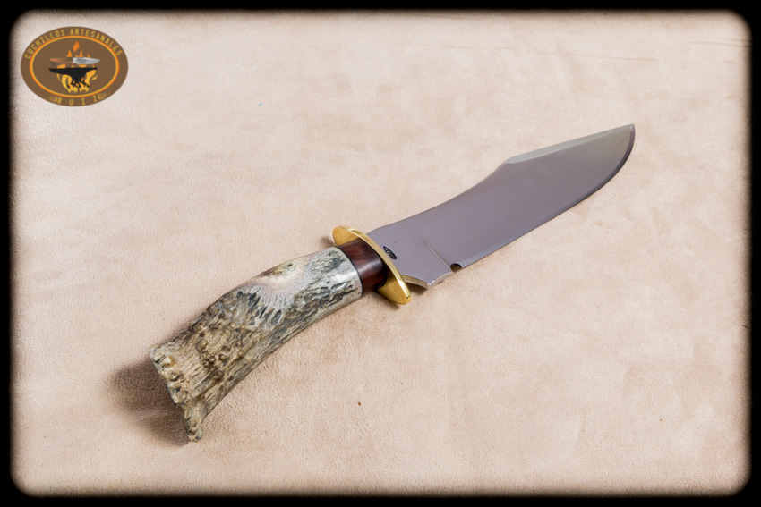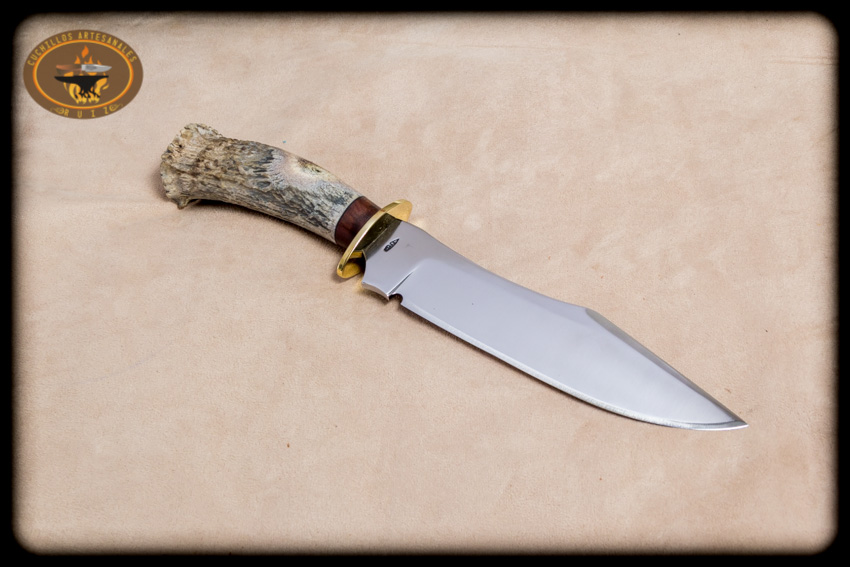 Bowie de 37 cms de largo total, hecho en acero al carbon O1 con temple diferencial para maximizar su resistencia a las tensiones mecánicas, hoja con pulido completo, encabe multipieza constituido por doble guarda en laton, madera de granadillo, separador negro y asta natural de ciervo cola blanca texano, funda en vaqueta de primera calidad.