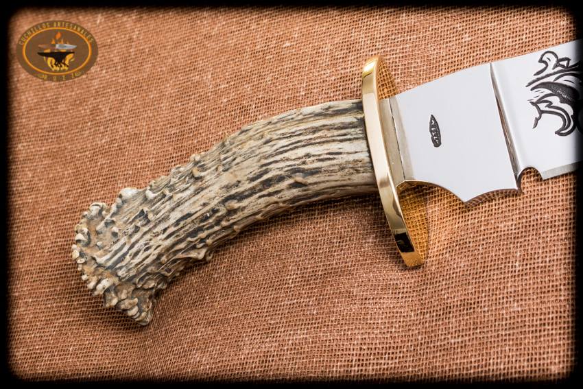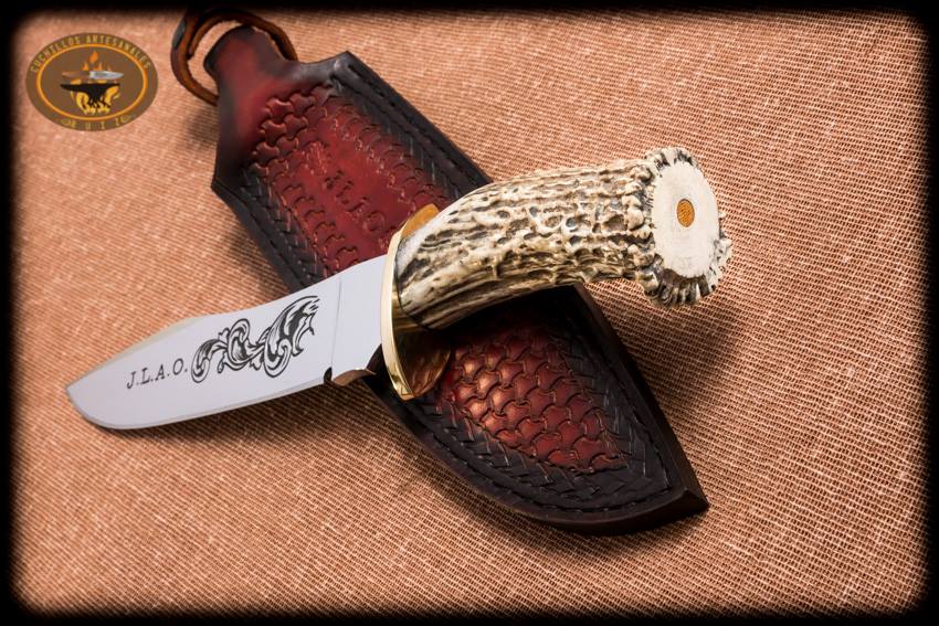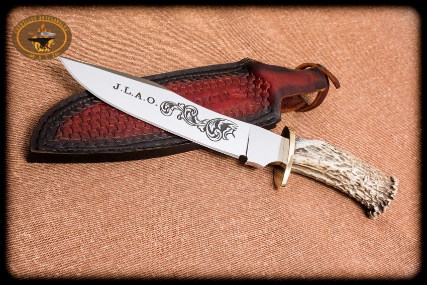 Cuchillo montero con acabado pulido al 100% y con la hoja grabada a mano con buril por ambas caras para resaltar aun mas la belleza del cuchillo con ornamentos e iniciales de su respectivo propietario, hecho en acero al alto carbono O1 nuevo de fabrica y de origen USA, 37 cms de largo total aprox, doble guarda en laton, hoja con espiga pasada y atornillada en la parte trasera del cabo, cabo en asta natural de ciervo cola blanca texano, funda en vaqueta de primera calidad cincelada a mano a preferencia de su propietario.