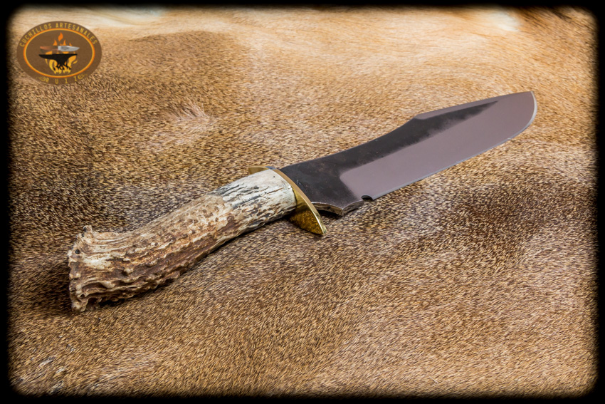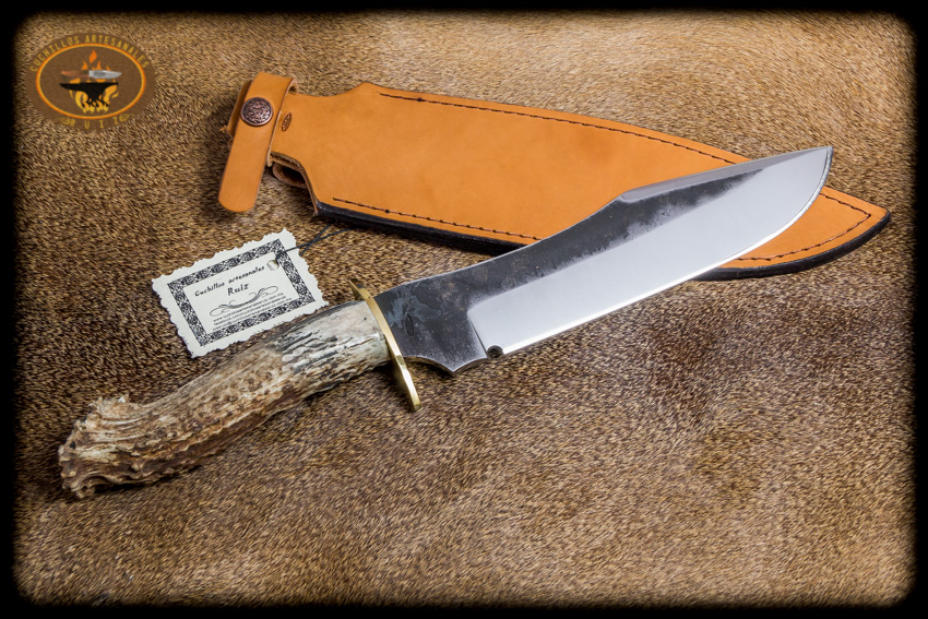 Cuchillo para monte hecho en acero al alto carbono O1 nuevo de fabrica y de origen USA, largo total de 34 cms, temple diferencial en la hoja, el acabado de la misma puede ser rustico como el de las imágenes o totalmente pulido si asi lo desea, doble guarda en laton, espiga pasada y atornillado en la parte trasera del cabo, cabo en asta natural de venado cola blanca texano, funda en vaqueta de primara calidad.