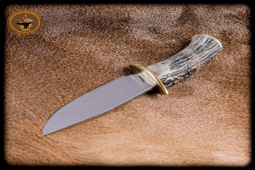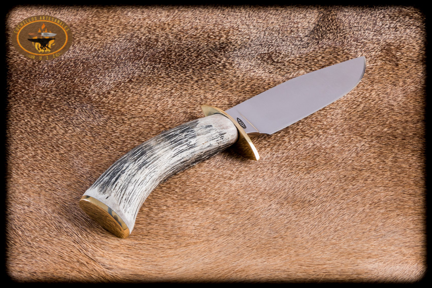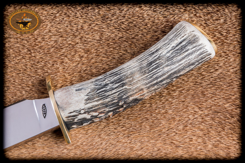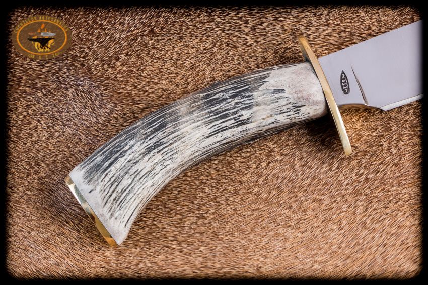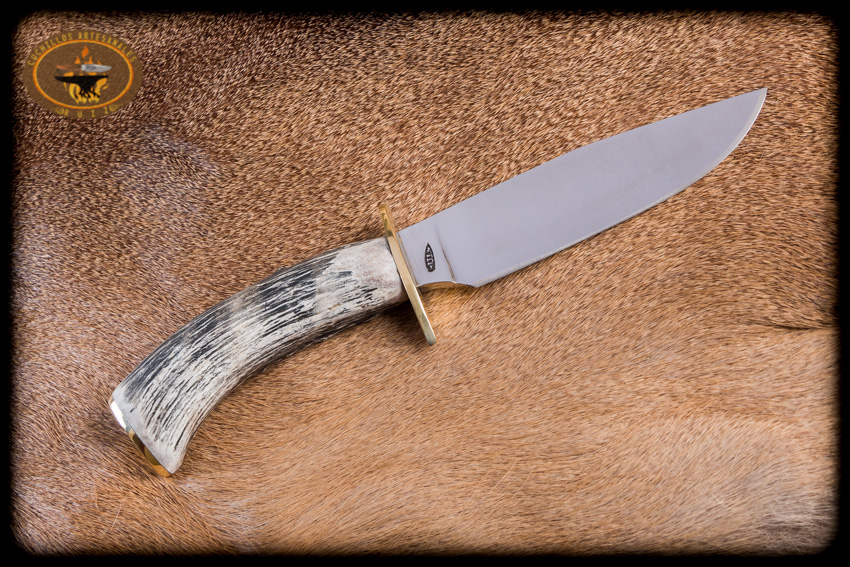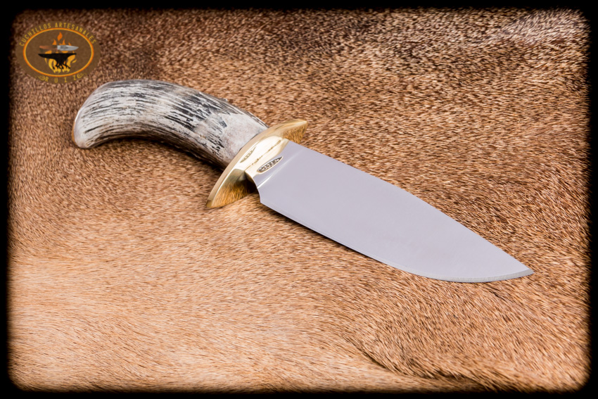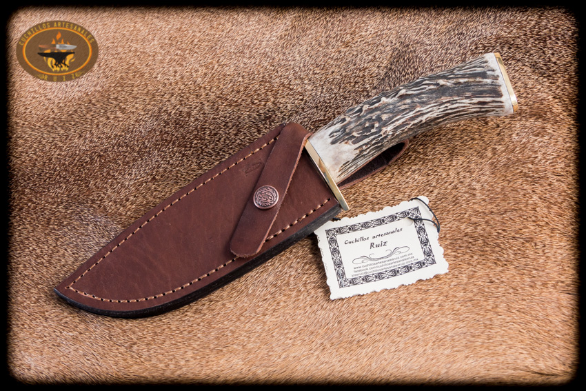Cuchillo Bowie modelo Ocelote hecho en acero al carbon O1, con 15 cms de hoja y 26 cms de largo total, doble guarda y tapa trasera en laton, cabo en asta natural de cola blanca Texano, espiga pasada, funda en vaqueta de primera calidad curada con aceite español.