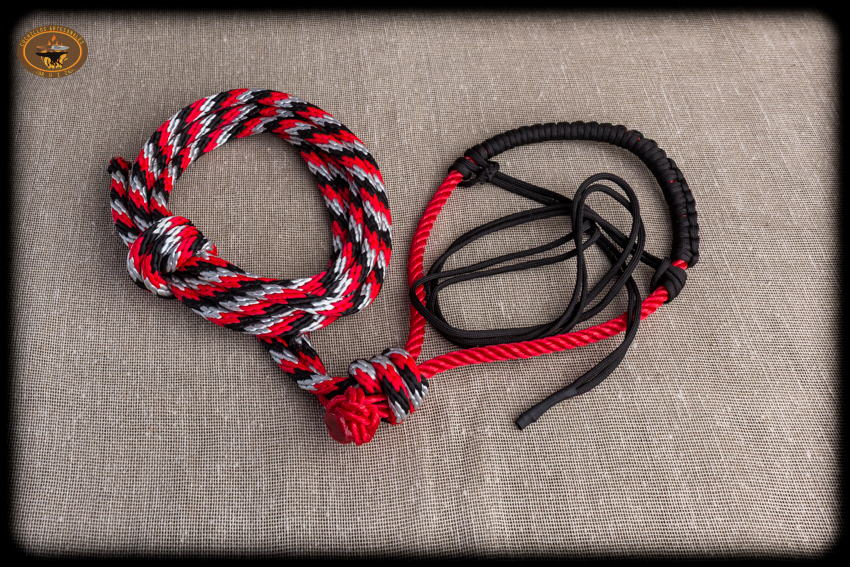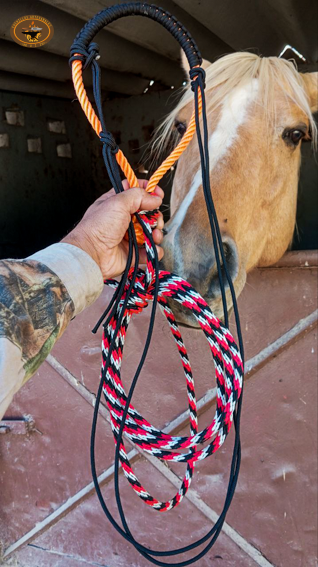 Bozalillo hecho de soga vaquera plastica de 8 mm  con boton diamante, puede ir tejido a mano con paracord en la zona de la ternilla o forrado con cuero cosido a mano, poste y cabezada de paracord y guía de seda derby 3 mts.