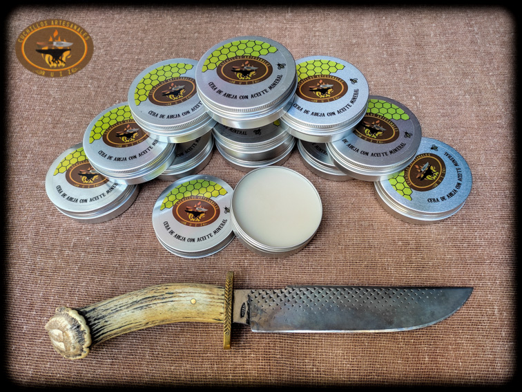 Cera de abeja con aceite mineral grado alimenticio para el cuidado de sus cuchillos de acero al carbón, fundas de piel, tablas para picar, tablas para cortar alimentos y tablas para presentación de alimentos, asi como para el cuidado en general de artículos de piel y de todo lo que desees que se proteja de la corrosión o que sea impermeable a la humedad.