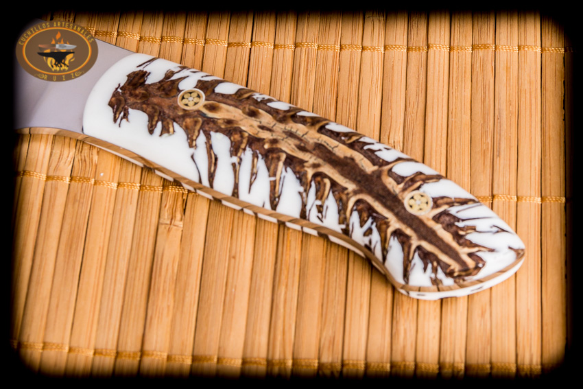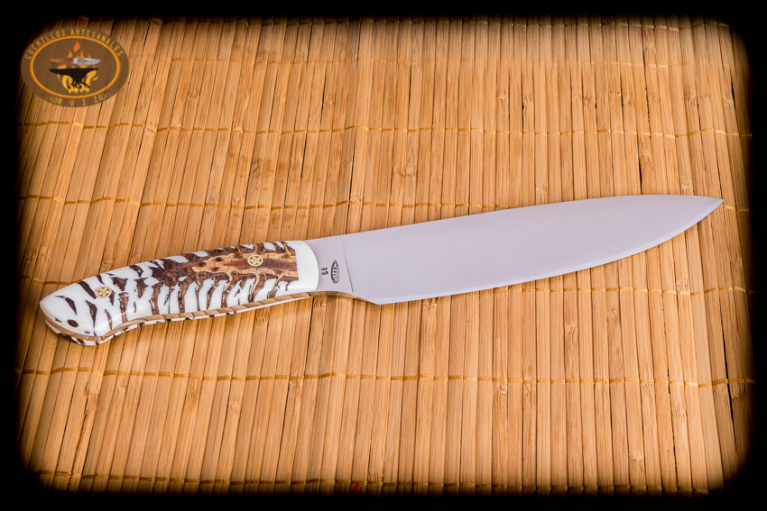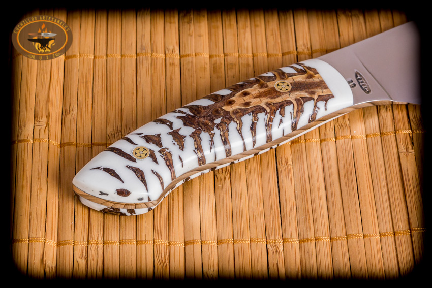 Ponemos a sus ordenes nuestro cuchillo para chef con cachas hibridas compuestas por piña de pino estabilizada con resina y encapsulada en resina epoxica (en esta ocasión color blanca) del color que el cliente decida dentro de la gama de colores que ofrecemos. El cuchillo esta hecho en acero D2 y mide 30 cms de linea pero puede ser al gusto del cliente en lo alto y largo; puede ir con una funda de vaqueta si el cliente lo desea la cual no esta incluida en el precio aqui publicado.