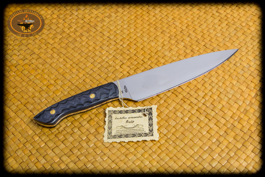 Nuestro Cuchillo Chef Clasico es el cuchillo de chef todo terreno que no puede faltar en tu cocina, es hecho en acero D2 para ofrecerles una dureza y retención de filo que te permitirá cortar y cotar por bastante tiempo sin necesidad de reafilado, con un acabado en el que se cuida hasta el mas minimo detallado, cachas en micarta (color de las cachas a escoger entre la gama de colores que tenemos para ofrecerles) y remaches mosaico.
