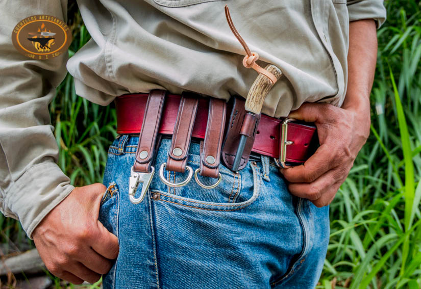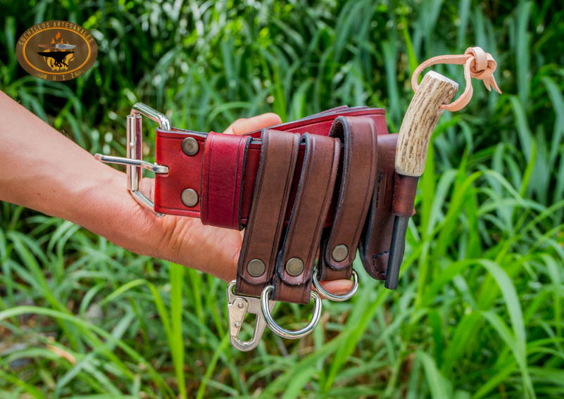 Cinturón de bushcraft hecho 100% en vaqueta nacional de primera calidad, es un cinturón de 2″ de ancho y se hace a tu medida, va sellado con cera de abeja liquida y resina para piel y otros componentes por la parte interna del cinturón y por la parte externa curado al aceite y con cera de abeja liquida así como con sus cantos sellados con cera de abeja liquida y resina, para una vida útil prolongada, lleva hebilla de un poste y un juego de presillas con media argolla, media argolla reforzada y bandola con destorcedor, también un ferrocerio custom con holster.