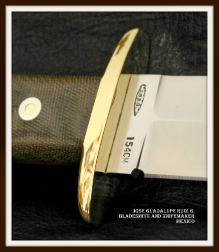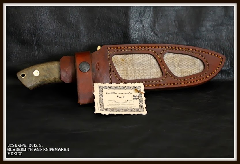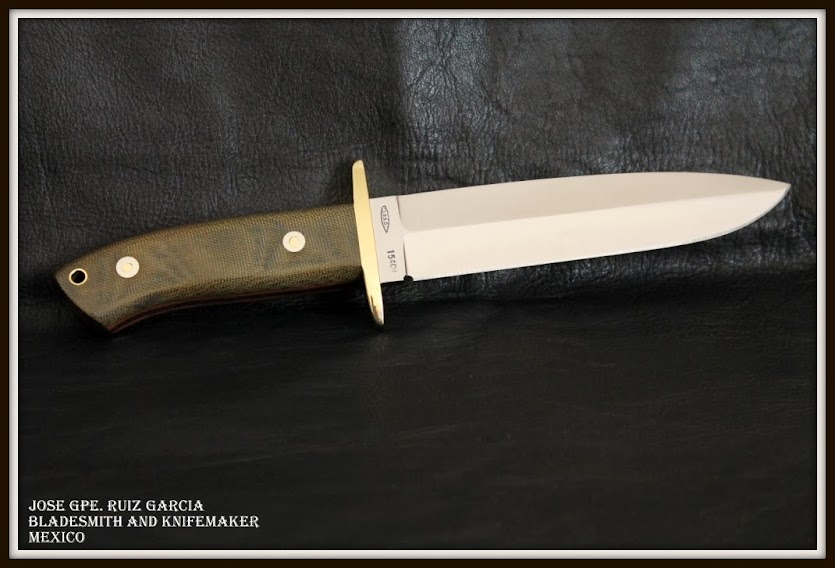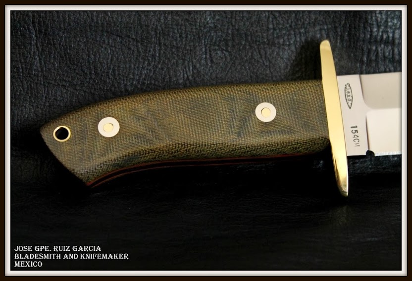 Cuchillo fighter que se puede hacer en el acero de su eleccion, en concreto el de estas fotografias  en acero 154CM, eEsperos 3/16″, largo total 27 cms, largo de la hoja 16 cms, doble guarda en laton, cachasen  micarta verde con separador rojo y remaches loveless, vaciado cóncavo a 4 mesas, pero con filo solo en la parte baja de la hoja, funda: hecha a mano totalmente por su servidor en vaqueta, y piel de culebra.