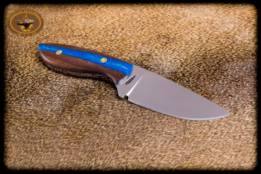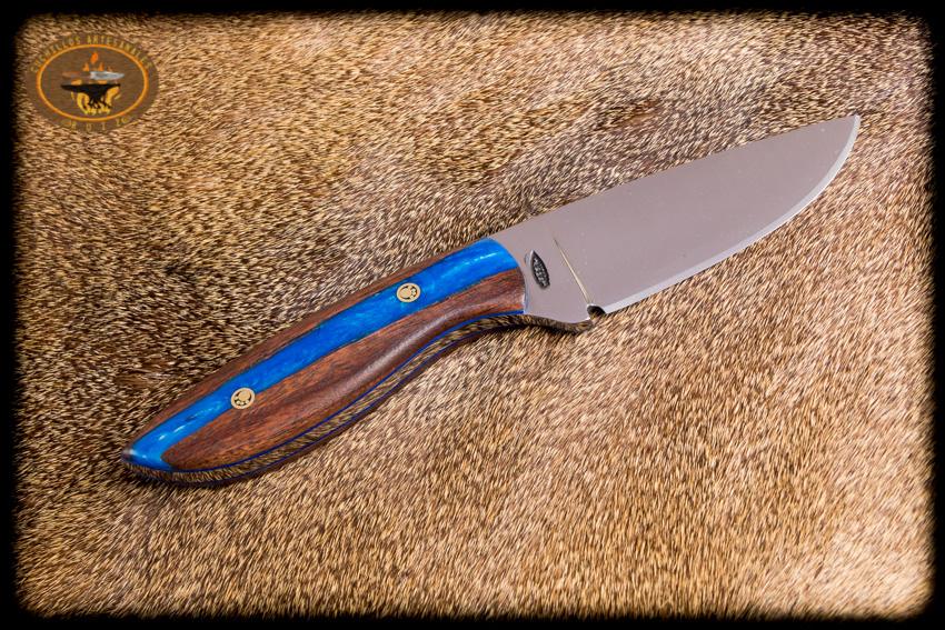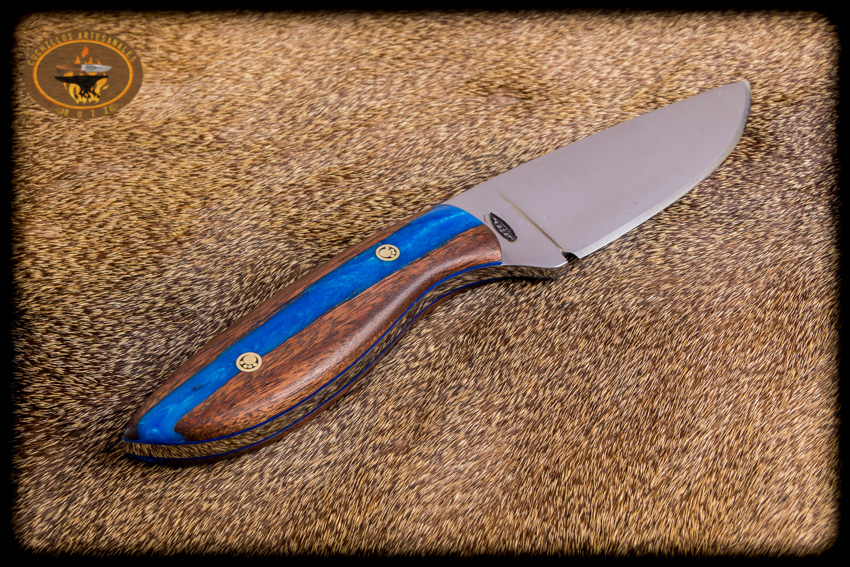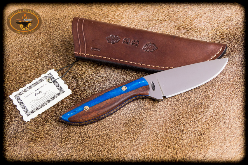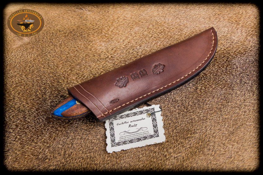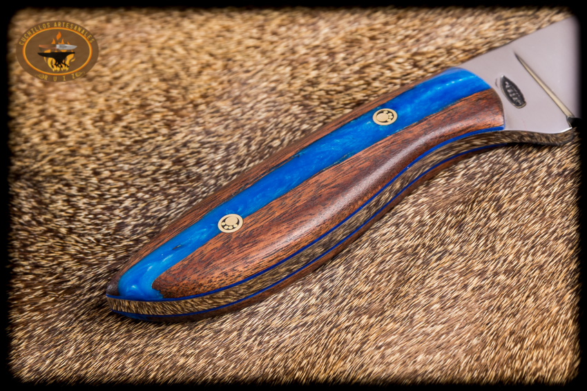 Cuchillo para caza y campo modelo carnero hecho en acero al carbon D2, 22.5 cms de largo total, bisel plano, cachas hibridas en madera de granadillo y resina epoxica pigmentada y perlada, con remaches de pata de oso, funda en vaqueta de primera calidad con iniciales grabadas y curada con aceite español.