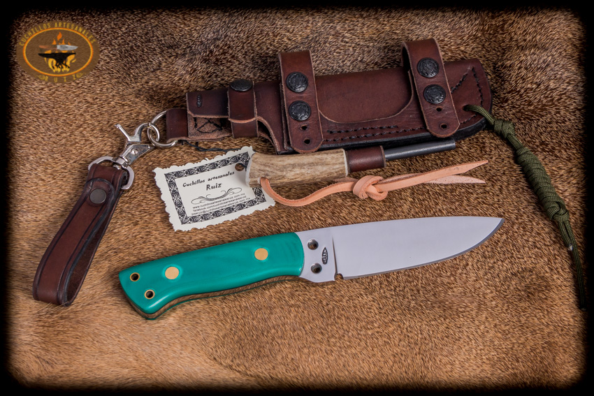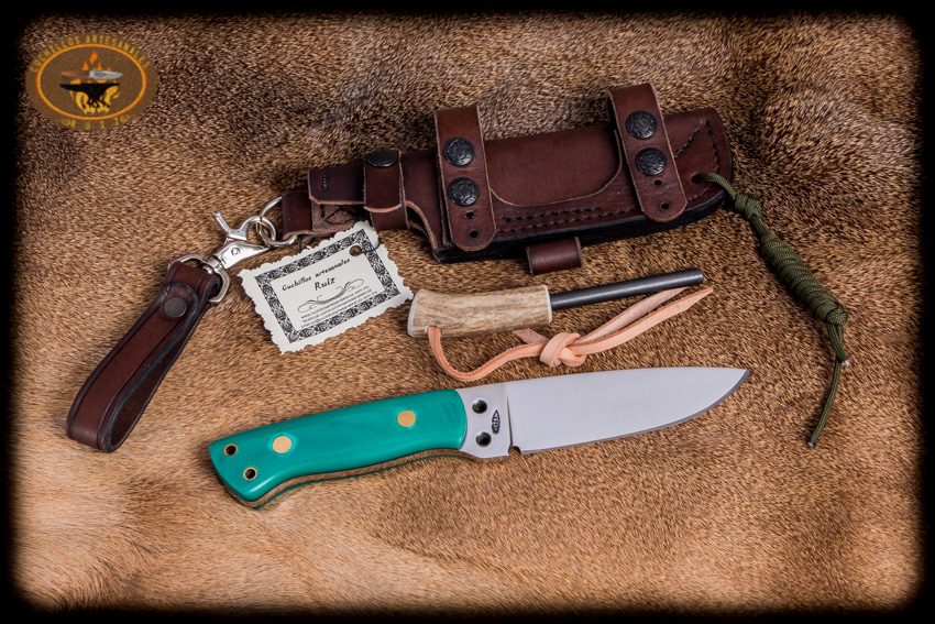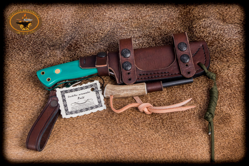 Cuchillo de bushcrafting hecho en acero de excelente calidad gama alta acero al alto carbono O1 (nuevo de fabrica y de origen USA), largo total de 23 cms, cachas en micarta (se puede escoger el color de las cachas), funda en vaqueta, va con un ferrocerio para iniciar fuego y 10 mts de paracord. El cuchillo se puede utilizar como punta de lanza atado a una vara con el paracord gracias a las 4 perforaciones que tiene.