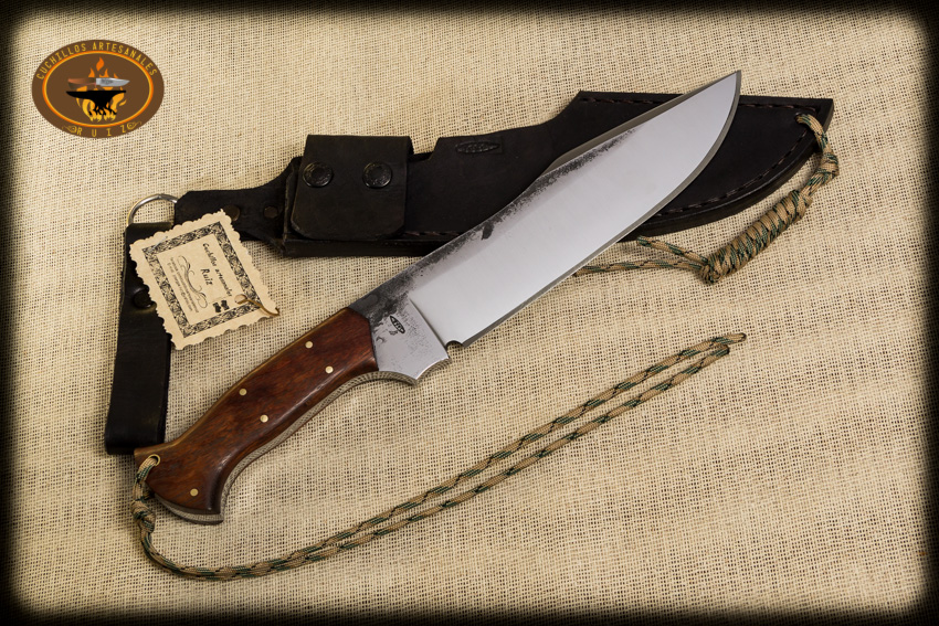 Cuchillo de campo modelo Bowie rustico hecho en acero al alto carbon 5160 con temple diferencial, con un largo total de 34 cms, acabado rustico, cachas en madera fina, funda en vaqueta de primera calidad, lleva paracord en la empuñadura y funda.