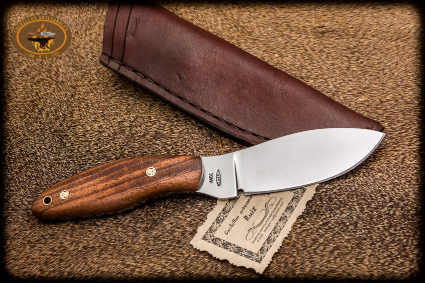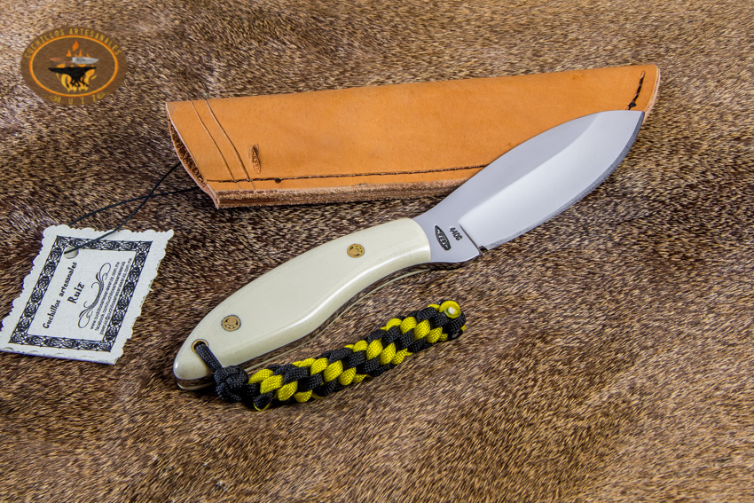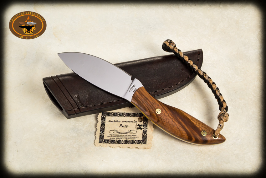 Cuchillo para caza y campo hecho en acero D2 que proporciona dureza y retención de filo superior al acero inoxidable 440C y 154CM, tambien con buena aceptación de resistencia a mancharse y la oxidación, 22.5 cms de largo total, filo con vaciado cóncavo y/o plano, cachas en micarta con lanyard en paracord (color al gusto del cliente ysi el cliente lo desea puede llevar cachas en madera fina y el precio es menor), remaches mosaico, funda en vaqueta.