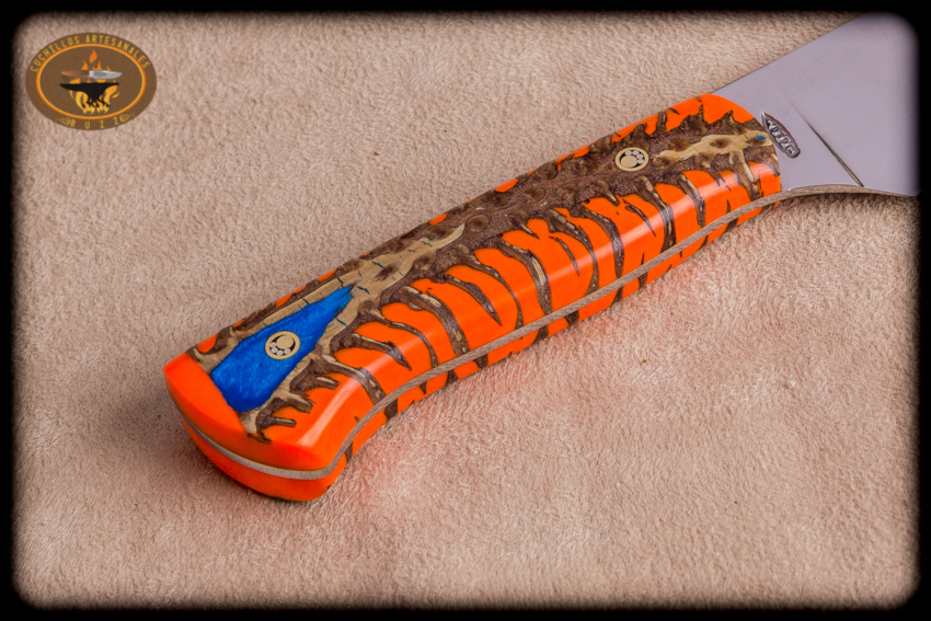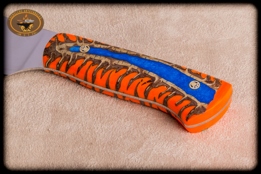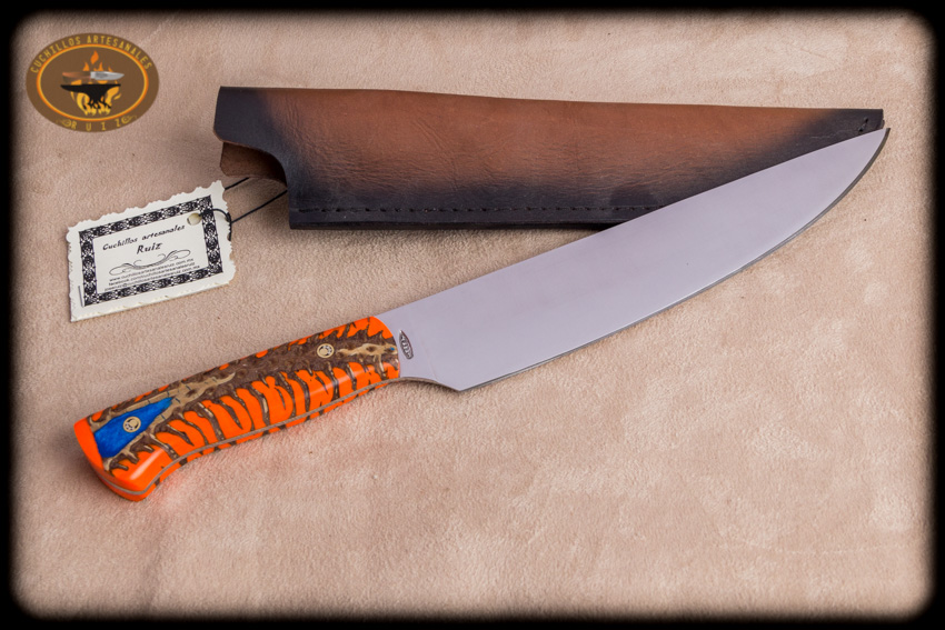 Ponemos a sus ordenes nuestro cuchillo para chef en el excelente acero inoxidable de origen Sueco Sandvik 14C28N   con cachas hibridas compuestas por piña de pino estabilizada  y  resina epoxica (en esta ocasión  color naranja y azul perlado) del color que el cliente decida dentro de la gama de colores que ofrecemos. El cuchillo  y mide 32 cms  de largo total y 4.5 cms de altura de linea, pero el tamaño puede ser al gusto del cliente en lo alto y largo, va una funda de vaquetilla con presilla para el cinturon va con una patina negra en la orilla su acabado en con cera carnauba y laca.