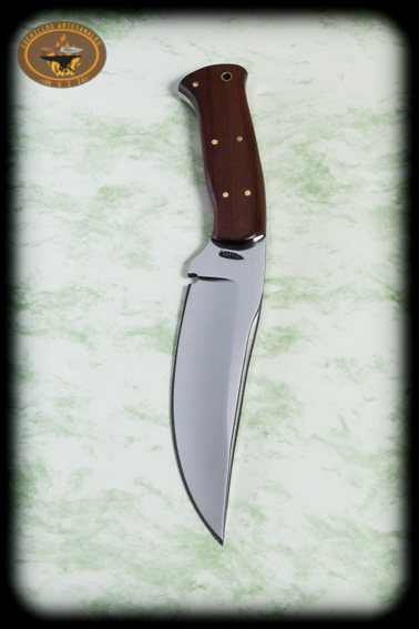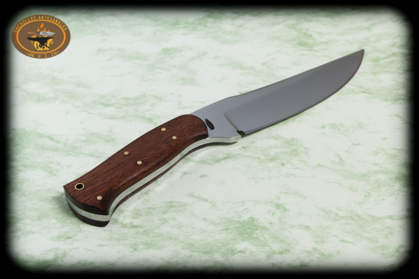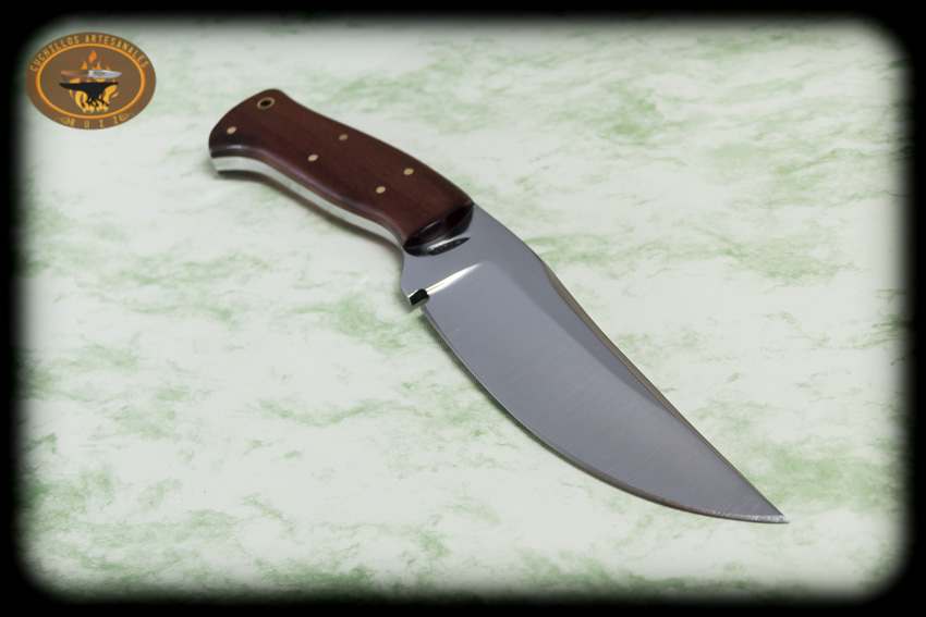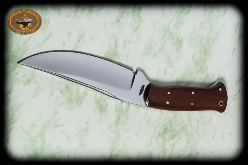 Cuchillo integral fighter hecho en acero al carbon O1, 26.5 cms de largo total, vaciado del filo cóncavo, cachas en madera de granadillo, remaches de laton solido y funda en vaqueta de primera calidad.