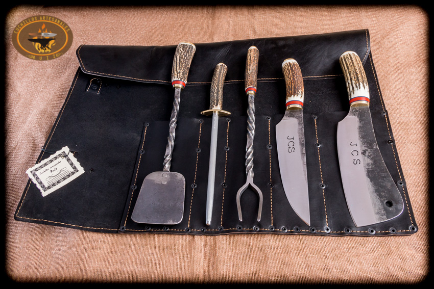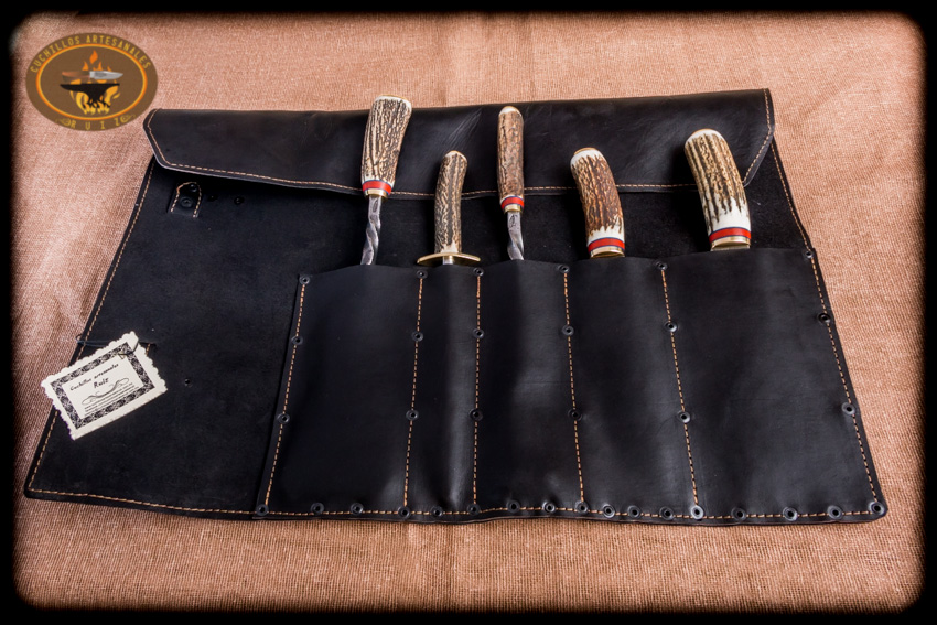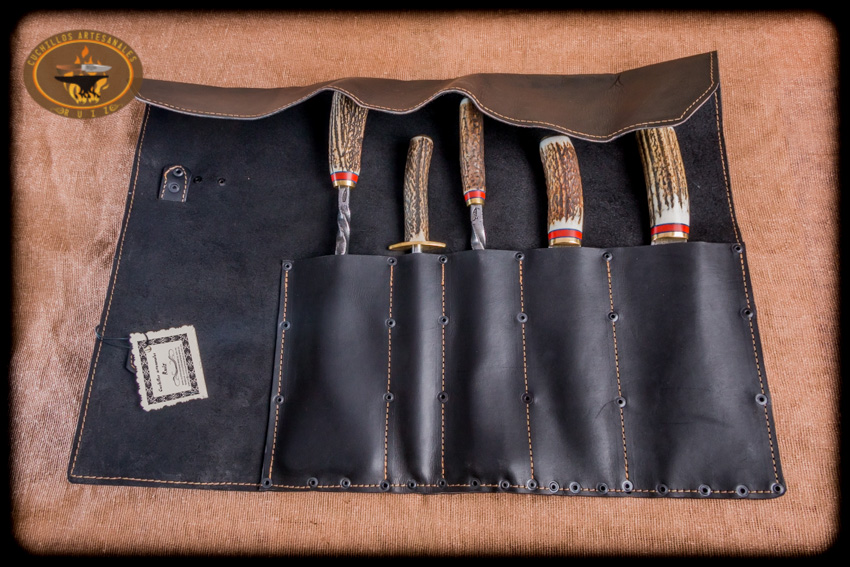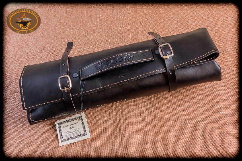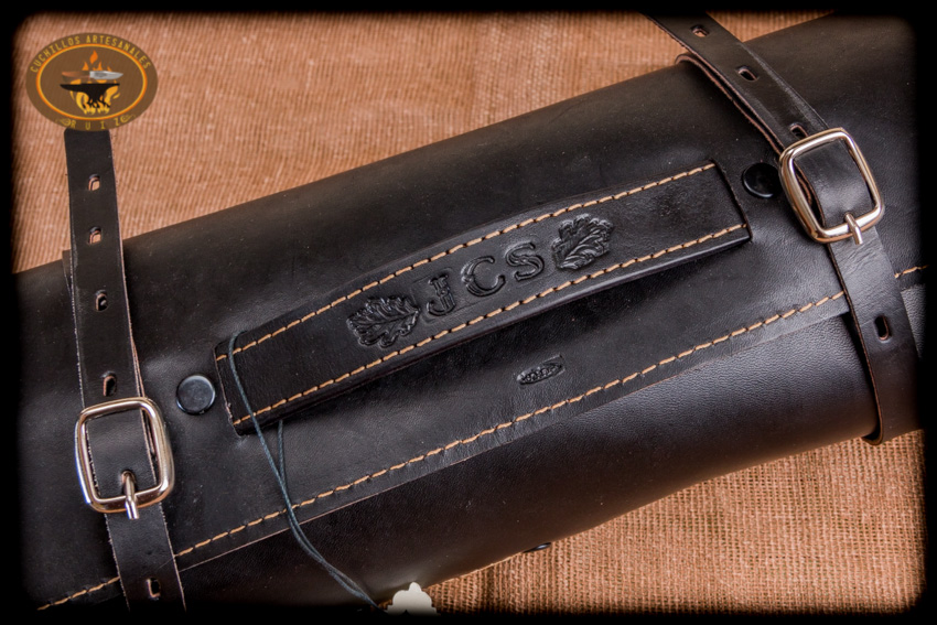 Funda de rollo para hachuela, cuchillo y utensilios, hecha de modo artesanal y 100% en cuero de primera calidad, va personalizada con tus iniciales y curada con aceite español lo cual genera un nivel de hidratación muy elevado para brindarle una vida útil mucho mas prolongada.