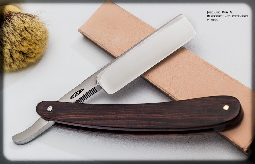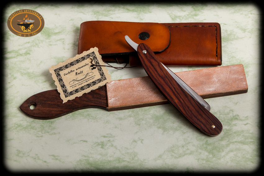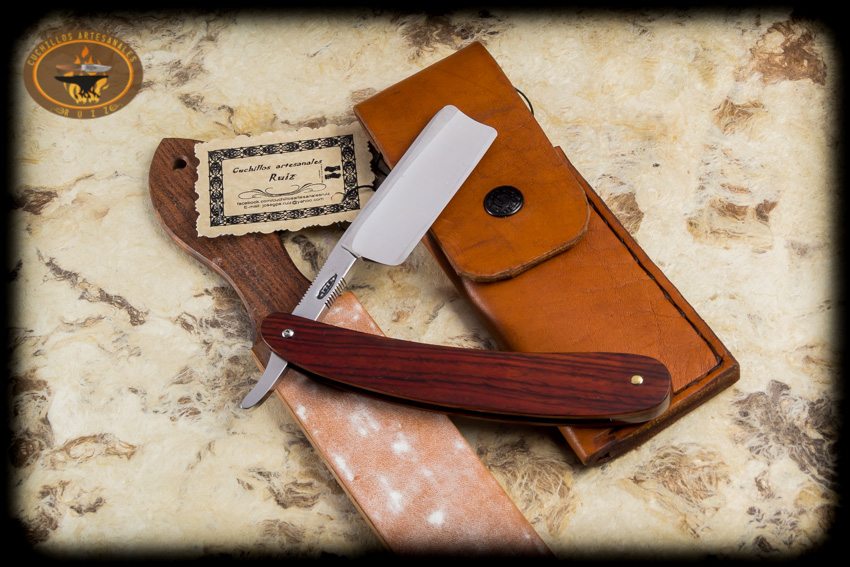 Navaja de afeitar hecha en acero al carbon gama alta O1, construida con cachas de madera de cocobolo, eje de la navaja de acero inoxidable roscado, va con una funda en vaqueta para su cuidado y transportación y un asentador hecho con madera fina y vaquetilla con micro abrasivo para asntar el filo antes y después de cada uso