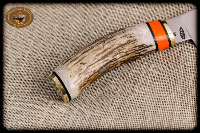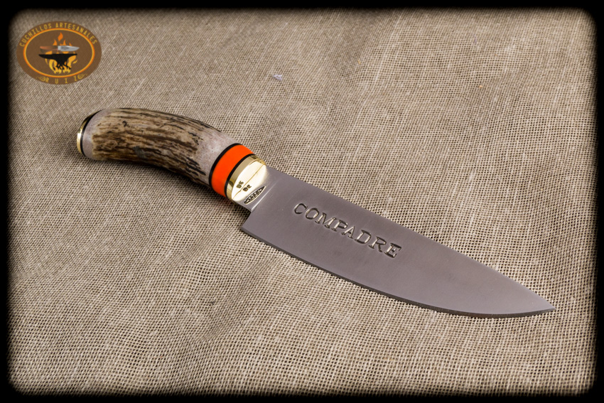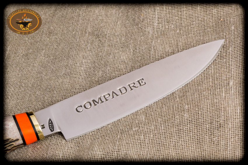 Cuchillo modelo criollo hecho en acero D2, largo de hoja 18 cms y largo total de 30 cms aprox, hoja grabada a mano con buril por su servidor, cabo multipiezas constituido por tapas en laton, separadores de micarta negra, rodaja de resina epoxica color naranja y asta natural de cola blanca Texano, funda en vaquetilla de primera calidad para portarse al cinturón.