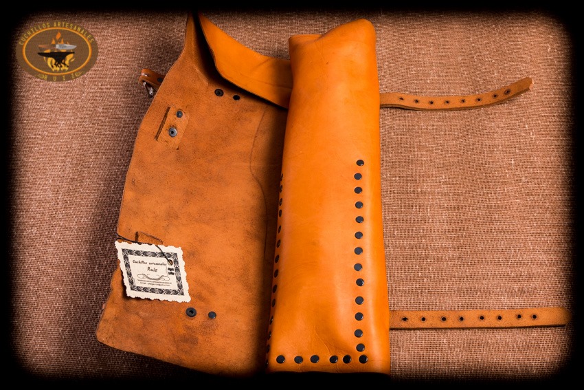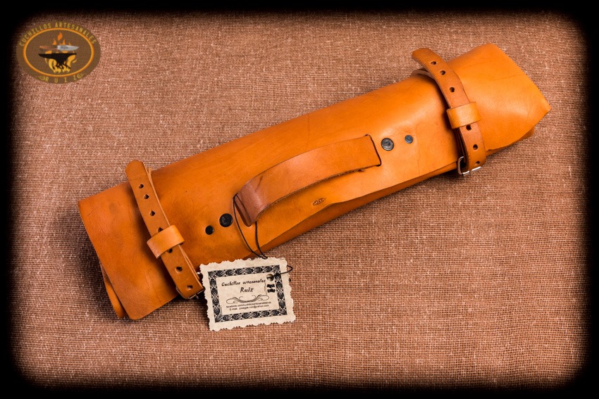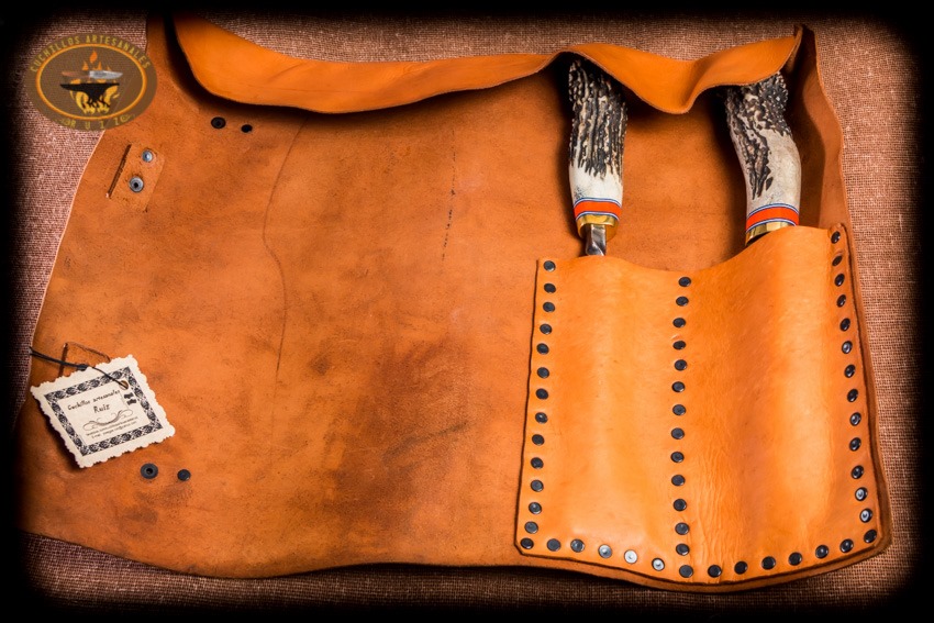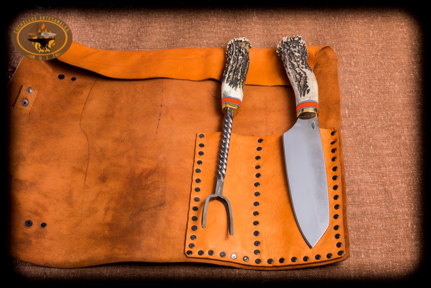 Si deseas un set para asado ligero y con lo indispensable para asar y procesar tu carne asada este set es para ti, este set esta conformado por un cuchillo estilo Santoko hecho en acero al alto carbono O1, fabricado con temple diferencial, y un trinche forjado a mano en acero 1018, ambos encabados en asta natural de ciervo cola blanca texano con separadores en micarta y tapas en laton, van en una funda de rollo en vaquetilla de primera calidad curada con aceite español lo cual le da una suavidad a la piel muy agradable al tacto, la funda de rollo es ideal e indispensable para su fácil traslado y manipulación de forma segura